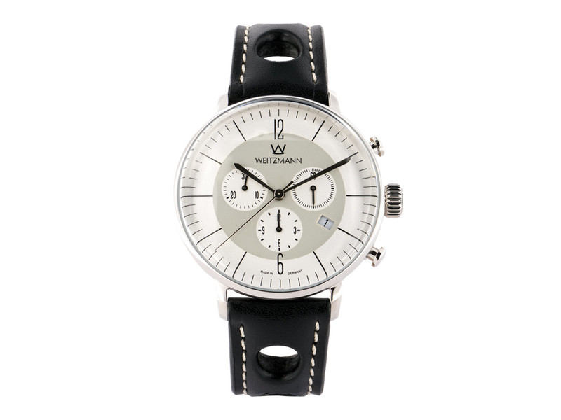 „Nur vollkommene Harmonie in der technischen Zweck-Funktion sowohl wie in den Proportionen der Formen kann Schönheit hervorbringen.“ (Zitat Walter Gropius). Besser kann dieser in Deutschland nach feinster Uhrmachertradition gefertigte WEITZMANN-Chronograph „Gropius Edition“ wahrlich nicht beschrieben werden: Die klare Formensprache des puristisch anmutenden Ziffernblattes in Weiß/Grau, Creme/Grau (Modell Dessau 2) oder auch Schwarz mit Carbon-Optik (Modell Bauhaus Carbon) mit Datumsanzeige auf der 4-Uhr-Position sowie Chrono-Funktionen ist stilvoll und elegant eingebettet in ein massives, poliertes Edelstahlgehäuse (Durchmesser 42 mm, Höhe 12,8 mm, 3 ATM) mit gehärtetem und damit kratzunempfindlichem Mineralglas sowie einem Schweizer Präzisions-Quarzwerk, welches sich durch seine Ganggenauigkeit und Langlebigkeit auszeichnet. Ein in Deutschland gefertigtes Echt-Lederarmband (Bandanschlag 20 mm mit Verlauf auf 18 mm) in verschiedenen Varianten runden den eleganten und zugleich klassisch zeitlosen Look dieses Chronographen ab und gewährleistet Tragekomfort auf hohem Niveau. Dieser Edel-Zeitmesser verkörpert die perfekte Zusammenführung von Kunst-Design mit Meister-Handwerk!