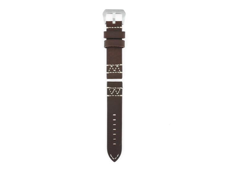 Echt-Lederband mit glatter, brauner Oberfläche und naturfarbener W-Ziernaht. Bandanschlag 22 mm, Länge 125/92 mm (XL), Dornschließe gebürstet.